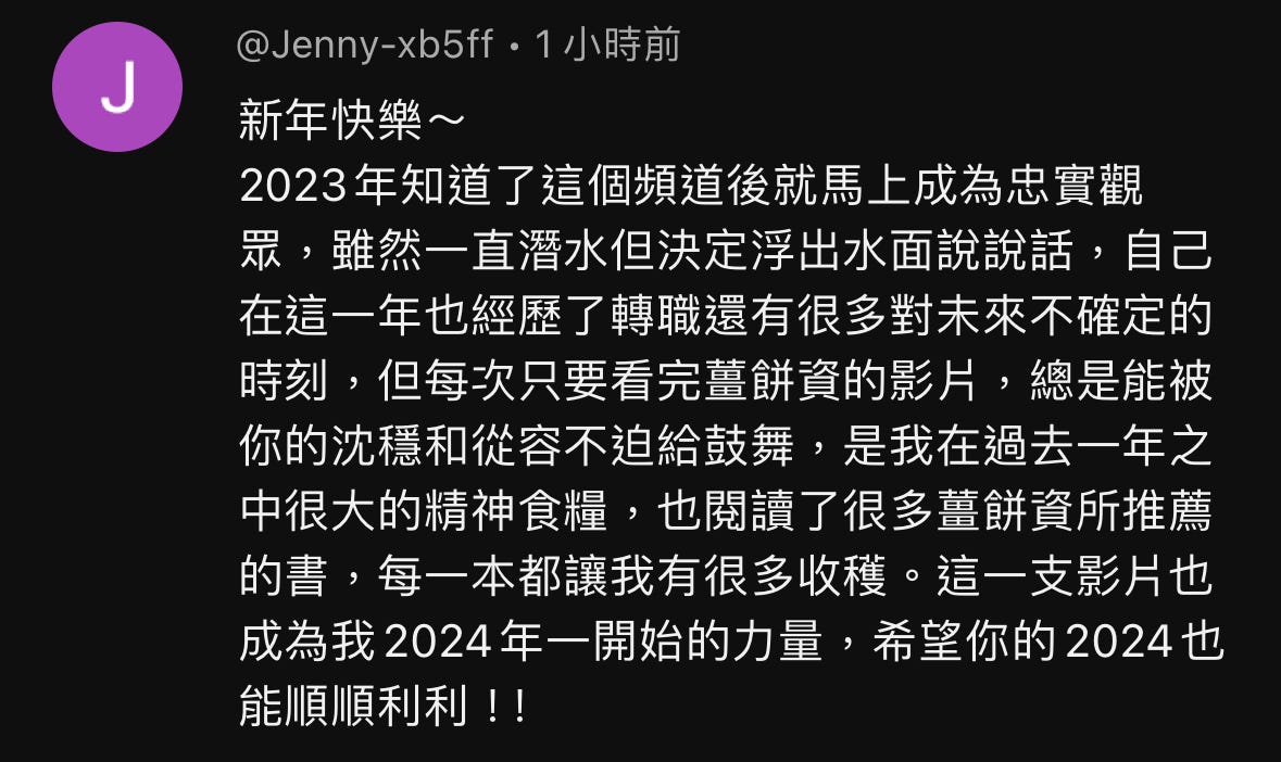 看到小薑餅留言和我分享,這支影片讓他們對2024年充滿力量和動力,讓我覺得非常開心!